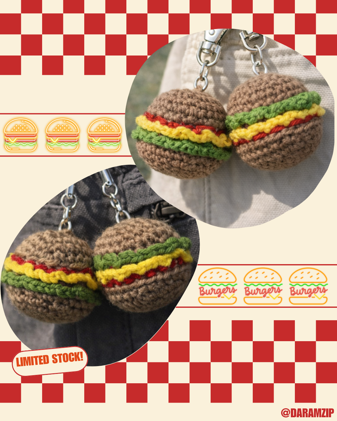 A handmade crochet burger keyring crafted to add a playful touch to your everyday carry.